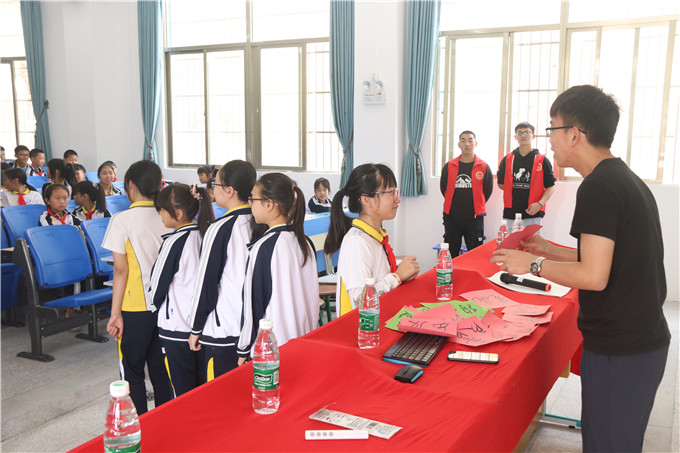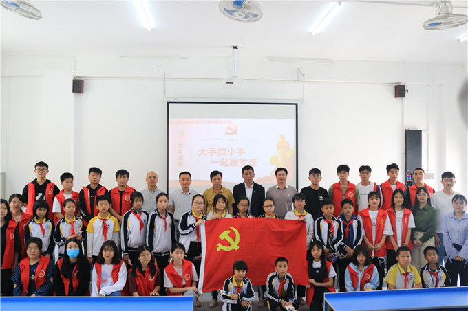 潮汕职业技术学院工商学院党总支以党史学习教育为契机,坚持街、校、社会组织联动,将党史教育渗透到学科德育教学支教活动里面。工商学院党总支书记尹华根组织全体教师党员、学生党员和学生会骨干一起前往贵政山小学开展党史教育活动,让少先队员们学党史、担使命,扣好青少年人生第一粒纽扣。 2021年4月15日上午,在潮汕职业技术学院党委的指导下,一场主题为“大手拉小手,一起跟党走”的党史教育活动在贵政山小学大礼堂隆重举行。此次活动由潮汕职业技术学院工商学院党总支与贵政山小学联合主办。潮汕学院党委委员、学工部部长兼团委书记钟逍彬、组织部长张爱国参加了此次党日活动。 学工第三党支部书记陈金辉同志用“我会讲故事”的小游戏开场带动会场气氛。 以生动活泼的形式带领少先队员们认识国旗、党旗、团旗、队旗和国歌,让少先队员们了解党团的历史,让在场的少先队员们感受在历史卷轴的大江大河中,体味浩然正气,明白没有共产党,就没有新中国。我们今天的幸福生活,都是先辈们一代又一代奋斗出来的,我们作为社会主义接班人,应该勇担重任,好好学习,天天向上。 活动中工商学院党总支的各位党员同志和学生会骨干给参加活动的200位少先队员们赠送了学习用品和小礼物,并与他们一起开展了“猜猜我是谁”的游戏,会场气氛再次被推上高潮。 活动结束后,全体党员、学生会骨干与贵政山小学领导老师合影留念。此次党日活动虽已圆满结束,党史学习活动还将继续,工商学院党总支将不断加强党史学习活动,让红色基因延续,薪火相传,初心永不忘。