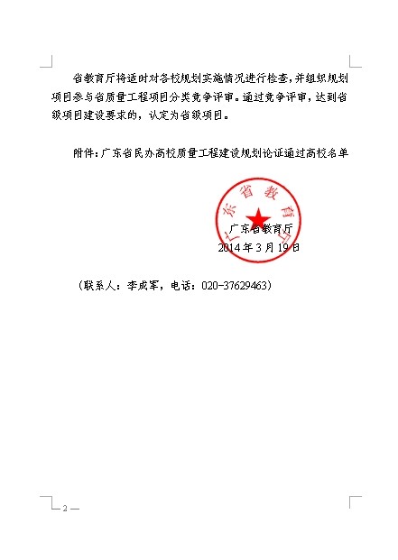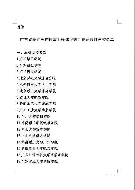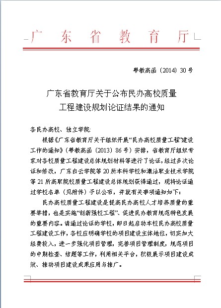 根据《广东省教育厅关于组织开展“民办高校质量工程”建设工作的通知》(粤教高函[2013]86号)安排,省教育厅组织专家对各校质量工程建设总体规划材料等进行了论证,经过多次论证和修改,广东白云学院等20所本科学校和潮汕职业技术学院等21所高职院校质量工程建设总体规划获得通过。 现转发粤教高函[2014]30号广东省教育厅文件:
