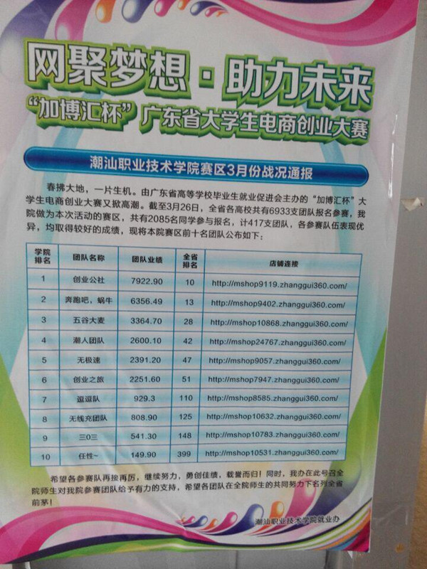 【喜讯】“加博汇杯”广东省大学生电商创业大赛 云腾两支队伍挤进全校前十名 为贯彻落实党的十八届三中全会精神,推动我省高校创新创业教育工作的深入开展,定于2014年12月~2015年05月举办“加博汇杯”广东省大学生电商创业大赛。 本次大赛,计算机信息工程系云腾美工推广工作室(教研室)14级有两支队伍突破极限,挤进全校前十名,现公布优秀队长和队员名单如下: 全校第7名 团队名称:逗逗队 团队业绩:929.3元 队长:李洪森 队员:蔡境,黄敏萍,许佳俊,郑御纹 指导老师:吴晓旋 全校第9名 团队名称:三0三 团队业绩:541.30元 队长:梁业逢 队员:梅纯纯,陈晓吟,黄福生,罗英红 指导老师:吴晓旋 大赛依托中国加工贸易产品博览会移动电商平台(加盈掌柜平台),通过“有收入、有奖励”的比赛形式,激发大学生创新激情和创业梦想,引领大学生积极参与电子商务创业实践活动。大赛通过团队赛的形式,分为“经营竞赛”和“综合竞赛”两个环节,最高单项奖金高达10万元,总奖金超过53万元。