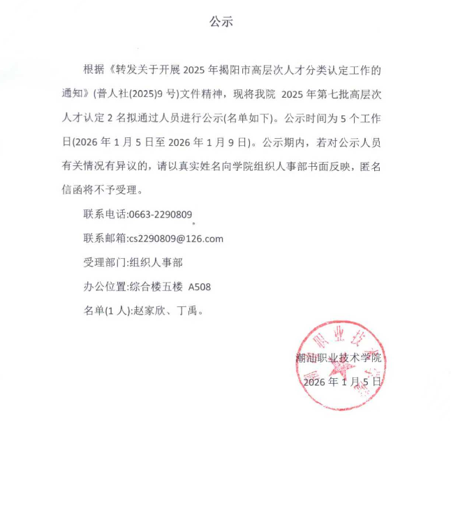 潮汕职业技术学院2025年第七批高层次人才认定2名拟通过人员公示
