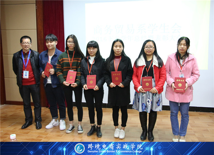 为推动我系学生会工作更好更强更长久的发展,12月28日下午,我系学生会在文体楼二楼召开了工作总结暨表彰大会。 本次大会到场的领导嘉宾有:商务贸易系主任陈江生老师、商务贸易系团总支学生会书记吴凯敏老师、跨境电商实战学院林少华老师、商务贸易系大一辅导员林渝桦老师、我系学生会主席团及全体成员。会议由我系学生会副秘书长李小花主持。 大会一开始,首先主席何建国讲话,他肯定并鼓励了每位部长和干事的工作,也感谢全体成员的辛苦付出,并希望在将来的工作上各个部门之间可以加强配合,共同努力;并对下学期我系学生会工作作出相应的计划展望;各部门部长依次对本学期学生会工作进行总结。 最后,系主任陈江生做了总结讲话,一是深化系学生会的服务职能;二是扩大活动范围,提高系学生会影响力;三是加大宣传力度,对相关工作的创新、加强部门内部的联系,做好部门的文化建设等。 领导嘉宾 主持人 主席总结 各部门部长总结 颁奖 颁奖 颁奖 优秀干事代表发言 系主任总结讲话 合 影