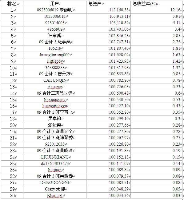 财金系讯: 在学院领导的关心和大力支持下,由我系组织承办的以叩富网(http://www.cofool.com/)为平台的“潮汕职业技术学院首届股票模拟交易比赛”自5月9日起正式接受我院学生注册报名,我院学生积极注册报名,截至5月16日正式开赛前计有182名学生参赛。 本次股票模拟交易比赛期间为按照现实深沪市正常交易时间为准,从5月16日起,至6月10日止,共四个交易周,第一个交易周总资产及总收益率前三十名学生的排名如下: