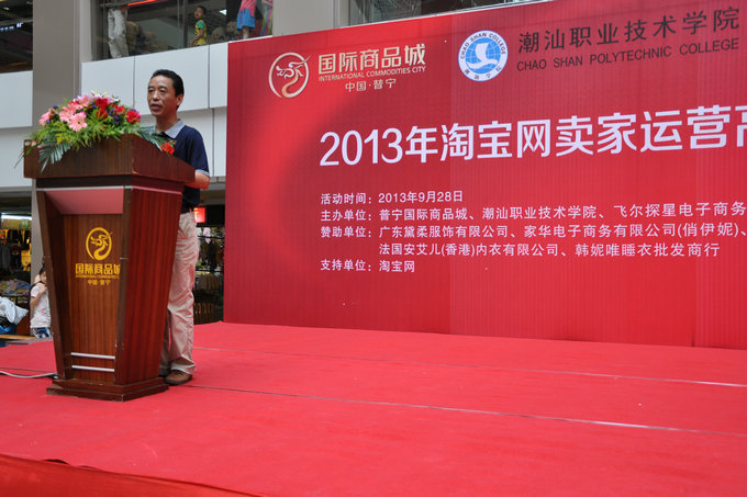 2013年淘宝网卖家运营高峰论坛(揭阳站)于9月28日在普宁国际商品城南中庭举行。本次活动由我院和普宁国际商品城、飞尔探星电子商务有限公司举办,我院副院长魏跃进、党委副书记张业宏参加了本次活动。