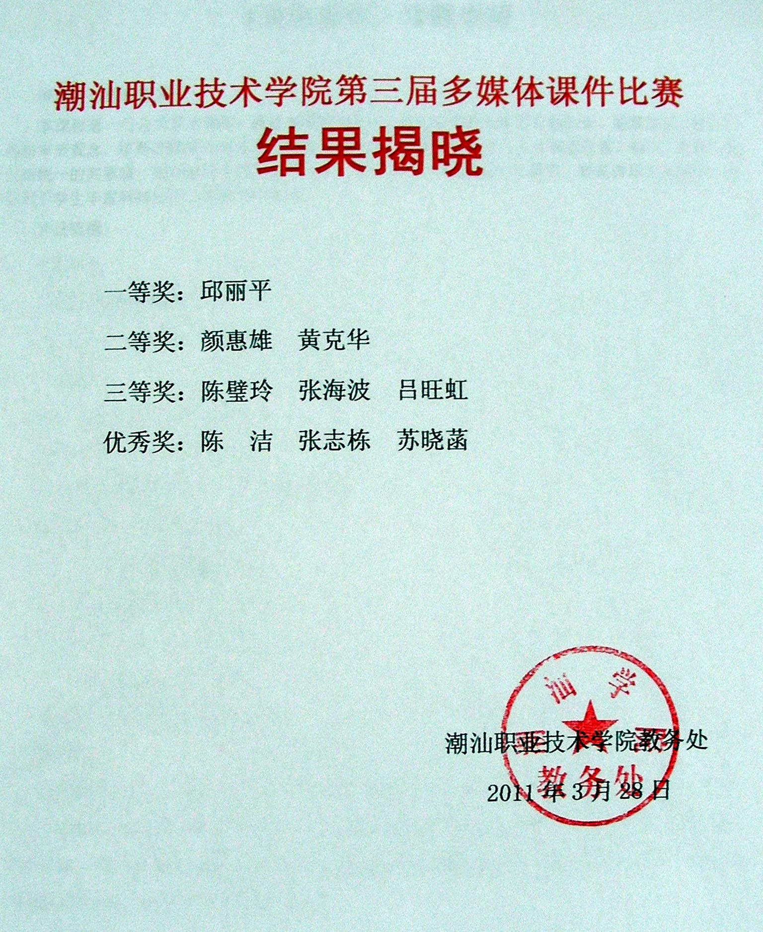好消息:在2011年3月27日上午学院举办的第三届多媒体课件比赛复赛中,数字设计工程系参赛的三位老师全部获奖,其中,邱丽平获得一等奖,黄克华获得二等奖,吕旺虹获得三等奖。特此祝贺!