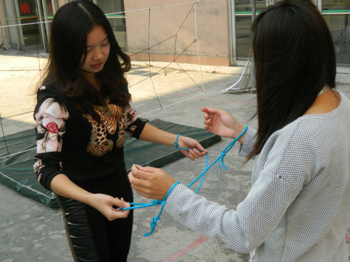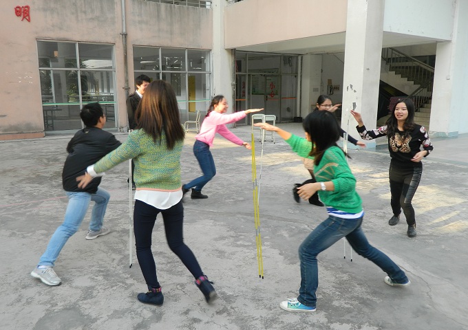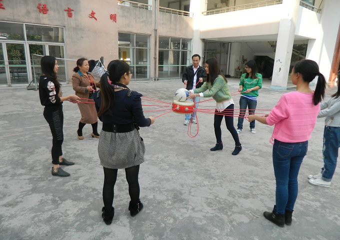 研讨活动在综合教学楼二楼平台举行,轻松愉快的气氛贯穿活动始终。在李冕鸿老师的的引导下,7名教师和在现场跟稿的新闻部学生一起开展了“雷阵”、“ 电网”、“ 不倒森林”、“ 齐眉棍”、“ 心有千千结 ”“动感颠球”“联合舰队”等一系列极富趣味性的拓展培训项目。现场活跃的氛围吸引了很多师生围观、参与,学院记者团还对活动中的师生进行了现场采访。