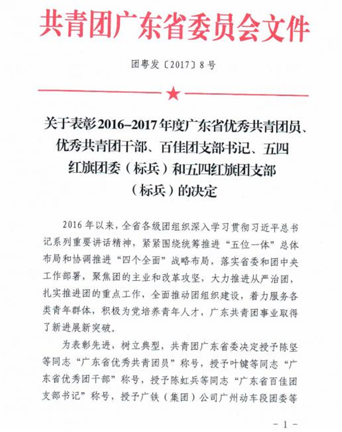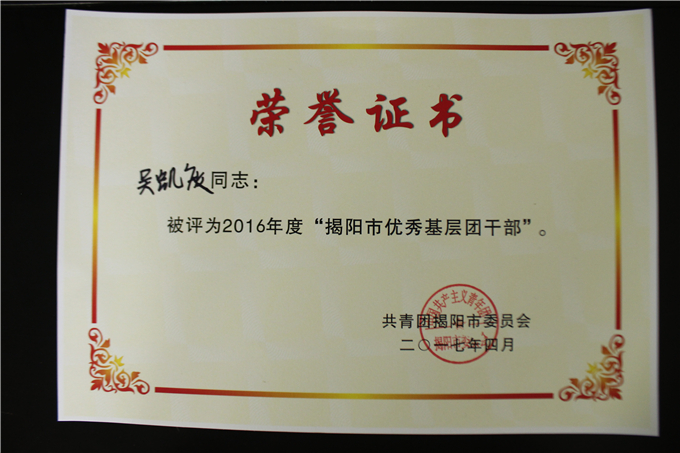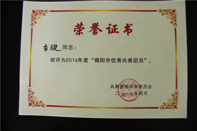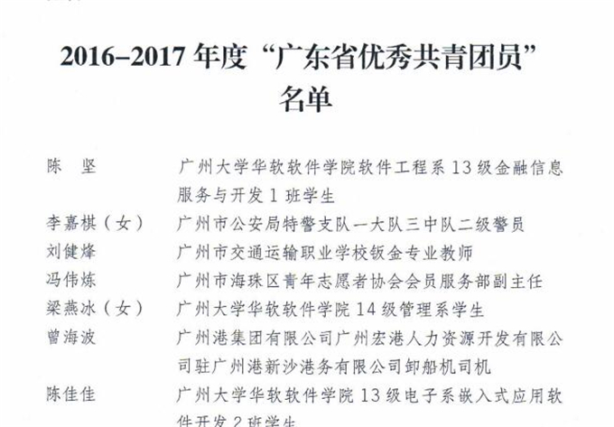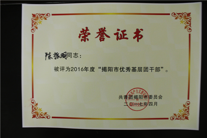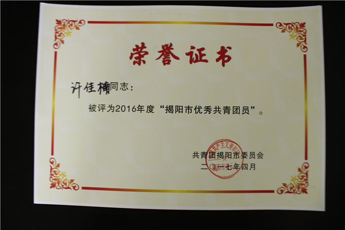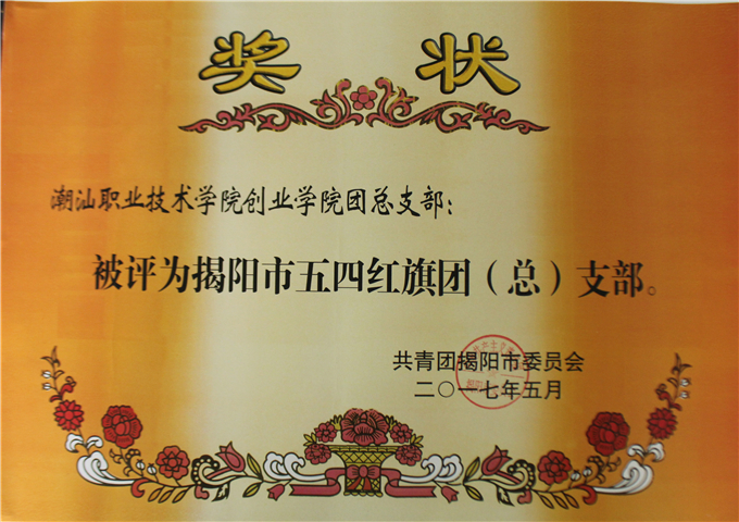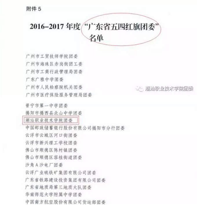 获奖名单如下: (省级) 潮汕职业技术学院团委荣获“广东省五四红旗团委” 许巧芬同志荣获“广东省优秀共青团员”荣誉称号 林沐宇同志荣获“广东省优秀共青团员”荣誉称号 (市级) 陈振明同志荣获“揭阳市优秀基层团干部” 刘任炫同志荣获“揭阳市优秀基层团干部” 吴凯敏同志荣获“揭阳市优秀基层团干部” 黄 霞同志荣获“揭阳市优秀共青团员” 郑雪娜同志荣获“揭阳市优秀共青团员” 陈国中同志荣获“揭阳市优秀共青团员” 李 旋同志荣获“揭阳市优秀共青团员” 许佳楠同志荣获“揭阳市优秀共青团员”