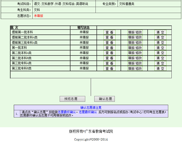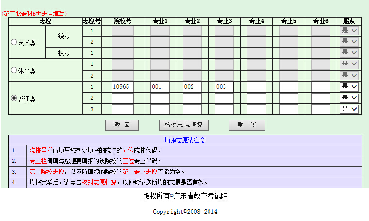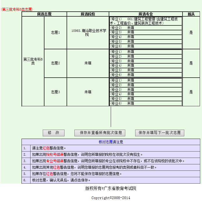 选择填报各个批次的志愿,输入院校号和专业代码(注意:在输入数字时必须按半角输入)。然后点击“核对志愿情况”按钮,系统会核对刚才所填的志愿是否符合专业目录的要求,页面如下(以填报“第一批专科B类”为例):