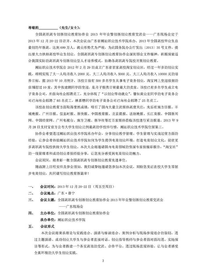 全国高职高专创新创业教育协作会2013年年会邀请函