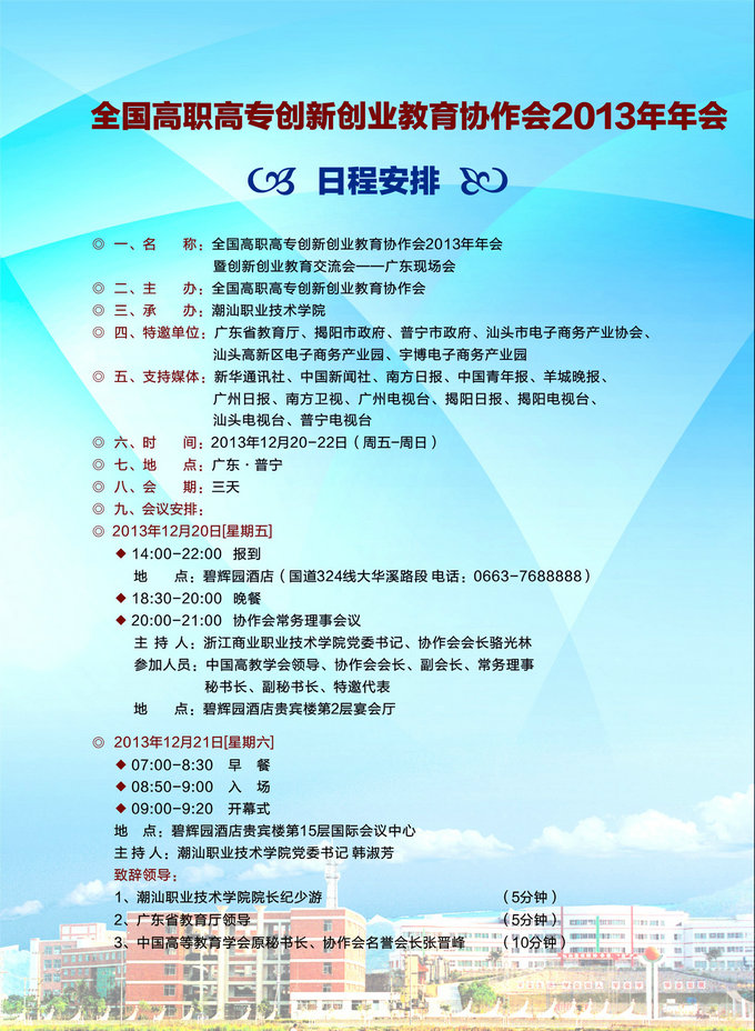 一、名称:全国高职高专创新创业教育协作会2013年年会 暨创新创业教育交流会——广东现场会 二、主办:全国高职高专创新创业教育协作会 三、承办:潮汕职业技术学院 四、特邀单位:广东省教育厅、揭阳市政府、普宁市政府、汕头市电子商务产业协会、汕头高新区电子商务产业园、宇博电子商务产业园 五、支持媒体:新华通讯社、中国新闻社、南方日报、中国青年报、羊城晚报、广州日报、南方卫视、广州电视台、揭阳日报、揭阳电视台、汕头电视台、普宁电视台 六、时间:2013年12月20-22日(周五—周日) 七、地点:广东·普宁 八、会期:三天 九、会议安排: 2013年12月20日[星期五] ◆ 14:00-22:00 报到 地点:碧辉园酒店(国道324线大华溪路段 电话:0663-7688888) ◆ 18:30-20:00 晚餐 ◆ 20:00-21:00 协作会常务理事会议 主持人:浙江商业职业技术学院党委书记、协作会会长骆光林 参加人员: 中国高教学会领导、协作会会长、副会长、常务理事 秘书长、副秘书长、特邀代表 地 点:碧辉园酒店贵宾楼第2层宴会厅 ◆ 07:00-8:30 早 餐 ◆ 08:50-9:00 入 场 ◆ 09:00-9:20 开 幕 式 地 点:碧辉园酒店贵宾楼第15层国际会议中心 主 持 人:潮汕职业技术学院党委书记 韩淑芳 致辞领导: 1、潮汕职业技术学院院长 纪少游 (5分钟) 2、广东省教育厅领导 (5分钟) 3、中国高等教育学会原秘书长、协作会名誉会长张晋峰(10分钟) ◆ 09:20-09:50 协作会年会 主 持 人:协作会秘书长 何伏林 1、骆光林会长作协作会2013年度工作报告和2014年工作计划 2、贾新民执行会长宣读获得“全国高职创新创业教育先进单位”名单 3、主席台领导为先进单位授牌 4、提请大会审议协作会新增补会员名单 5、主席台领导为新增会员单位颁发证书 ◆ 09:50-10:10 茶 歇 ◆ 10:10-11:40 主题报告 主 持 人:协作会执行会长 贾新民 1、高校创业教育与专业实践教学体系的融合与构建 教育部高等学校创业教育指导委员会委员 贾少华教授(30分钟) 2、创业教育与专业教育相融合的探索与实践 中山职业技术学院 何祥文 副教授 (30分钟) 3、创新创业教育任重而道远 中国高等教育学会会长助理 协作会顾问 曹胜利 (30分钟) ◆ 11:45-13:50 午餐、午休 ◆ 14:00-15:30 主题报告 主 持 人:潮汕职业技术学院党委书记 韩淑芳 1、电子商务创业主题报告 潮汕职业技术学院创业学院院长 颜惠雄 (20分钟) 2、电商创业教学管理、学生管理与实战运营经验分享 潮汕职业技术学院创业学院副院长 张志强 (20分钟) 3、平创团队的创业故事:平凡人创业,创不平凡的成绩 潮汕职业技术学院创业学院创业班学生 黄业宏 (10分钟) 4、淘宝创业改变了残疾人的人生轨迹 潮汕职业技术学院创业学院创业班学生 陈伟祥 (10分钟) 主 持 人:潮汕职业技术学院创业学院院长 颜惠雄 成功创业学生经验分享 优秀创业团队代表 (30分钟) ◆ 15:30-16:30 参观潮汕学院校内创业基地 ◆ 16:30-18:00 参观潮汕学院校外创业基地 ◆ 18:00 晚餐 2013年12月22日[星期日] ◆ 07:00-8:30 早 餐 ◆ 08:30-18:00 创业活动考察 ◆ 18:00 晚餐