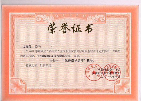 10月26日,通过校内选拔赛的两支队伍在B507参加2019年第四届“科云杯”全国职业院校高职组财会职业能力大赛网络赛。我院方秀玲、陈少玟老师以出色的教学质量,带领潮汕职业技术学院荣获二、三等奖,被授予“优秀指导老师”称号。