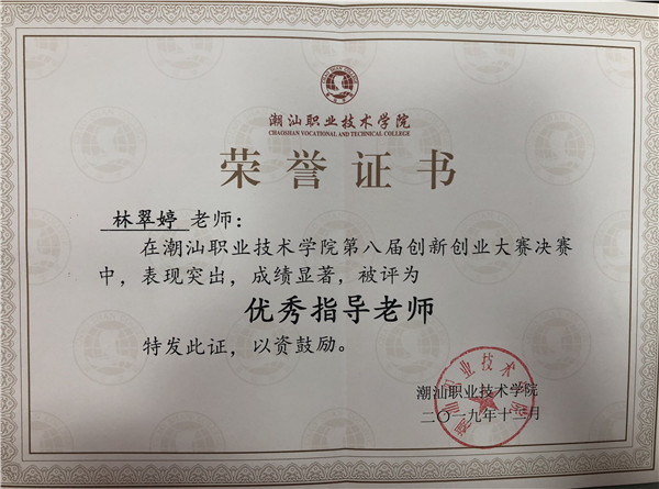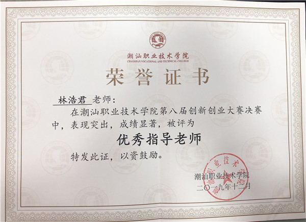12月17日,为时2个月的第八届创新创业大赛比赛结果最终确定,我院林浩君、林翠婷老师表现突出,成绩显著,获创新创业优秀指导老师称号。