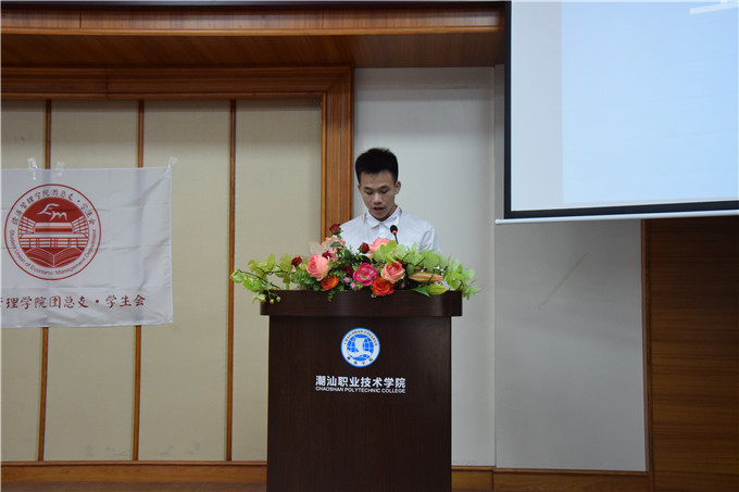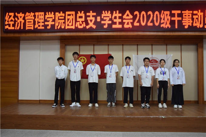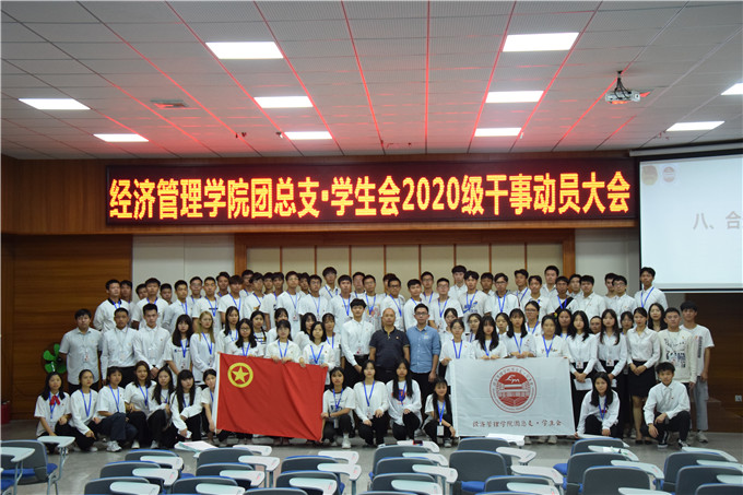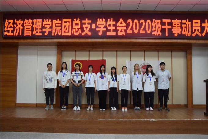 2020年11月4日中午,经济管理学院团总支学生会在第二报告厅召开2020级团学干部动员大会。出席本次会议的领导老师有:经济管理学院党总支书记尹华根、经济管理学院团总支书记陈金辉,本次会议由生活权益部干事谢俊典主持。 大会第一项议程 奏团歌 动员大会在嘹亮的团歌中拉开序幕。 大会第二项议程 党总支书记尹华根致词 尹书记在会议中对团学干部提出希望和要求:他希望团学干部要牢记自身使命,勇于担当责任、要强化服务意识,做好自我管理,要把握宝贵机会,提高综合素质,也要勤奋努力,正确处理学习与工作的关系;希望本届团总支学生会一起努力,不忘初心,继续发扬经管学院优良传统,为学院发展做出新贡献。 大会第三项议程 团总支书记陈金辉宣读新一届干事名单 大会第四项议程 团总支副书记兼学生会执行主席陈小芸发言 她说学生会作为学校的学生组织,是以学生为主体,全心全意为学生、老师服务的组织。希望学生会的每一位成员能够继续发扬“务实创新、甘于奉献、勇于担当”的服务精神。 大会第五项议程 新干事代表杨永堃发言 杨永堃同学表示:作为学生会的新生干事代表,一定会坚定自己的初心,树立脚踏务实的工作态度,努力创新奋斗,为学院的发展贡献自己的一份力量。 大会第六项议程 各部门负责人介绍部门工作内容 大会第七项议程 授牌仪式:为干事佩戴工作牌 大会第八项议程 合影 本次动员大会的顺利举行,让新一届的学生会成员明确了自己身上所肩负的责任,在未来的日子里,学生会将以更加积极和踏实认真的工作态度服务全体师生,为经管学院的发展做出应有的贡献。