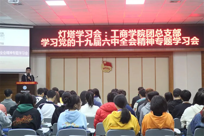 2021年11月23日晚上9点,工商学院团总支部组织全体团学成员在学院第一报告厅开展“学习党的十九届六中全会精神”会议。本次学习会议由团总支书记陈金辉主讲。 工商学院团总支书记陈金辉在会议中为同学们讲解了党的十九届六中全会的重要内容,勉励全体团学成员要认真学习全会精神,并在实际工作中发挥团学骨干的作用,为学院的发展奉献力量。 随后,全体团学成员在会上观看了有关中国共产党第十九届中央委员会第六次全体会议相关学习视频。通过视频的学习,全体团学成员更加清楚的认识到党的百年奋斗中我们党为什么能够成功、弄明白了未来我们怎样才能继续成功,从而更加坚定、践行初心使命,从小事做起,自觉承担责任,为同学着想,秉持学生会优良作风。 习近平总书记说:爱国,是人世间最深层,最持久的情感,是一个人立德之源,立功之本。每个人都应该认识到,爱国不仅仅是一个词汇,是流淌在我们每个人血液里的基因,更是我们出发的起点,奋斗的支点。梦在前方,路在脚下,作为团学的一份子,我们要坚定不移跟党走,要脚踏实地,努力学习做栋梁。