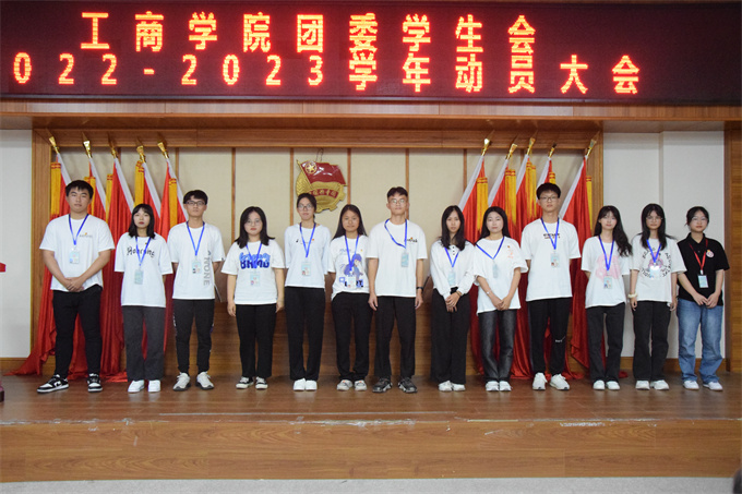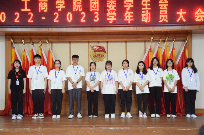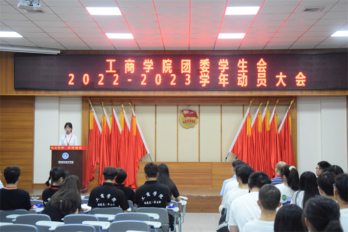 叶落惊秋,丹桂飘香,十月,正是硕果累累的好时节。 2022年10月14日下午,工商学院团委直属部门、学生会在第一报告厅组织召开了2022-2023学年动员大会。 出席本次会议的领导老师有: 工商学院院长张文洲,党总支书记尹华根,团委书记陈金辉。 本次大会由学生会学习部负责人张继凤主持。此次大会共六项议程。 大会第一项议程 奏团歌 动员大会在雄伟激昂的团歌中拉开序幕 大会第二项议程 工商学院团委书记陈金辉宣读新干事名单 工商学院团委直属部门 宣传部:宋晓诗、郑文乐、洪妍、黄锴华、张喜霞 、李丽花 、曾淑盈、官营光、杨嘉欣、张巧茹 组织部:张美琦、曹佳莹、王涛、梁土珍、杨冬妮、何智浩、谢斌、张伟志 文娱部:黄文思、李卓、黄晓纯、吴科霖、刘汝莹、徐林峰 体育部:徐壬未、陈雪凤、袁煜政、陈秒书、张万城、詹佳琳、黄静瑶、萧侢武 工商学院学生会 学习部:吕纯钿、黄俊鑫、郑炫博、黄运富、张佩敏、周星霞、曾宝燕、徐楚凡、黄倩怡、陈佳华、林良鹏、唐晓玲 办公室:黄琪好、欧阳坚、谢琼、苏凯旋、岑文诗、郭雅铉、李文雅 生活部:冯淑媚、陈鑫鑫、张哲桐、程安怡、卢锦彬、林煊杰、周文浩、黎红君 大会第三项议程 学生会执行主席张单嘉发言 大会第四项议程 新干事代表黄文思发言 大会第五项议程 一、学生骨干的角色定位。 二、当学生骨干的意义。 三、学生骨干的要求。 四、学生骨干在工作中的注意事项。 大会第六项议程 团学各部门负责人给新干事颁发干事牌