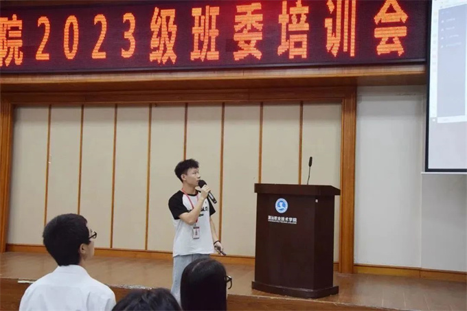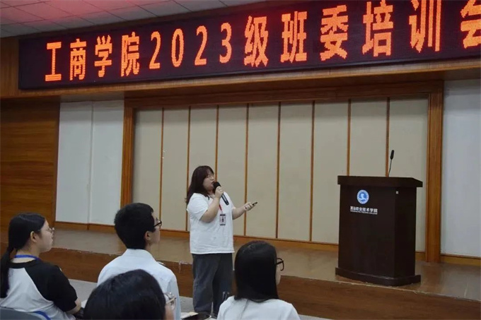 班委培训会|责任在肩 共学共进 为了后续相关工作的开展与落实,搭建好沟通桥梁,2023年11月14日,工商学院团学在第二报告厅开展23级班委培训会。会议由学生会主席团代表黄运富主持。 大会第一项内容 组织部部长张伟志 1.讲解智慧团建的使用方法与团支部专题学习的录入 2.团员组织关系的管理 3.每月团费的催缴以及督促每期青年大学习的学习情况 学习部部长郑炫博、周星霞 1.负责每周协助校团委学生会学习部考勤,每月制作教师反馈表。 2.定期举办班风评比会议。 生活权益部部长冯淑媚 1.介绍教室卫生评分标准。 2.定期开展校园卫生劳动教育。 大会第二项内容 征集意见 本次培训会加强了学生会与班委会的联动作用,为今后工商学院各项学生活动和工作的开展打下坚实的基础。也希望全体学生干部对工作要尽职尽责、积极向上,发挥好学校与学生之间桥梁、纽带的作用。在生活、学习中更好地为同学服务。