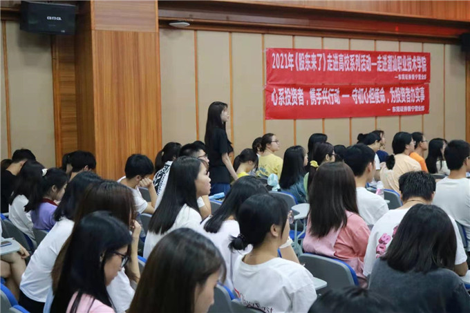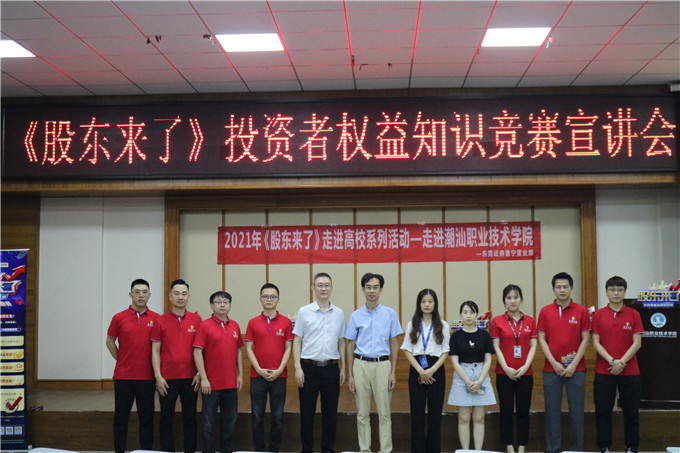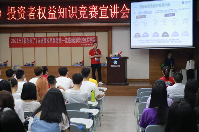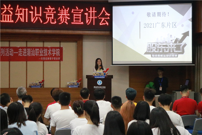 《股东来了》2021投资者权益知识竞赛活动正在全国范围内如火如荼的开展着。东莞证券作为广东片区的承办单位,组织分支机构齐动员、齐部署、齐行动,充分发挥各家自身优势,解放思想,全力推广本次活动。2021年5月17日晚上7点30分,就带着《股东来了》2021主题活动暨投资者权益知识竞赛宣讲会走进了潮汕职业技术学院。 出席嘉宾有张文洲院长、袁洁冰老师、刘嘉星老师以及东莞证券普宁营业部负责人肖创雄、东莞证券普宁营业部投教专员杨永波等等。 活动开始后由校方代表刘嘉星老师主持介绍活动单位及宣讲会目的。随后本活动领导负责人即东莞证券普宁营业部负责人肖创雄上台致辞。 之后由东莞证券普宁营业部投教专员杨永波宣讲本次《股东来了》活动的相关情况,讲解了此次活动的主题、活动目的及活动规则,还说明了本次活动旨在号召学生积极参与答题并通过全国性知识竞赛答题活动,提升学生的学习兴趣,提升对投资知识、权益保护、公司治理、法律法规等相关专业知识的认识和理解。 同时还分享了选股逻辑经验,增加了互动问答环节,赠送礼品。现场的同学也对此次活动表现出了极大的热情,积极参与答题。 第一项议程结束,举行第二项议程第七届“东方财富杯”金融知识讲座专题,由校方代表主持人刘嘉星老师上台对第二个活动第七届“东方财富杯”全国大学生金融精英挑战赛作简单的赛前培训。 活动圆满结束,最后由校方代表主持人刘嘉星老师对于本次活动进行总结。经过此次活动,同学们对《股东来了》投资者权益知识竞赛及“东方财富杯”全国大学生精英挑战赛有了初步的了解,更多的同学对报名参加活动充满积极性,你还在等待什么,赶紧报名参加吧。 第七届"东方财富杯”全国大学生金融精英挑战赛,分为校赛、省赛和国赛三个阶段,参赛学生及团队使用大赛专用平台“东方财富"APP进行模拟交易。 想要报名的同学可通过手机应用商店搜索及下载“东方财富”APP,点击首页“更多”按钮进入新页面,在页面底部选择“金融挑战赛”,或是点击首页左上角-我的头像-金融挑战赛,点击“我要报名”后填写个人信息即可报名或是登录大赛官网:young.eastmoney.com/xyds报名参赛。