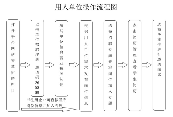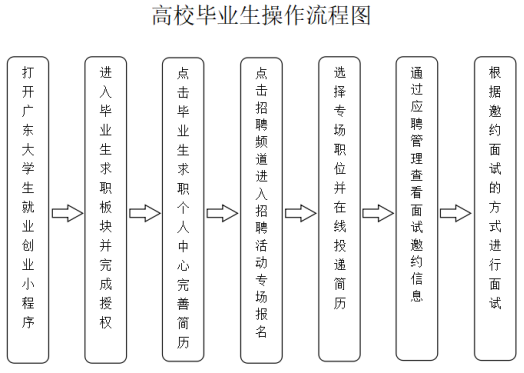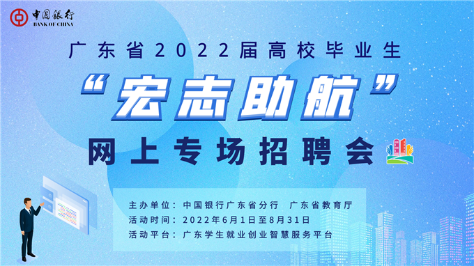 “宏志助航”网上专场招聘会邀请函 为贯彻落实党中央、国务院“稳就业”“保就业”和巩固拓展脱贫攻坚成果有关决策部署,坚持就业优先战略,抓住当前高校毕业生求职关键期,全力促进高校毕业生更加充分更高质量就业,中国银行广东省分行、广东省教育厅决定依托广东学生就业创业智慧服务平台(以下简称“平台”)联合举办广东省2022届高校毕业生“宏志助航”网上专场招聘会。 主办单位:中国银行广东省分行 广东省教育厅 活动时间:2022年6月1日至8月31日 活动平台:广东学生就业创业智慧服务平台 平台网址:http://job.gd.gov.cn 企业参会流程:未在平台注册的用人单位,请通过“https://job.gdedu.gov.cn/comp/#/register”进行注册报名(流程详见附件,邀请码:265889),已在平台完成注册的企业直接将岗位加入专题即可参加本次活动。 活动期间省教育厅将根据毕业生提交的求职意向和用人单位的用工需求精准匹配推送岗位给全省高校毕业生。 技术支持:林工 客服电话:020-87607080 附件:企业、学生参会流程