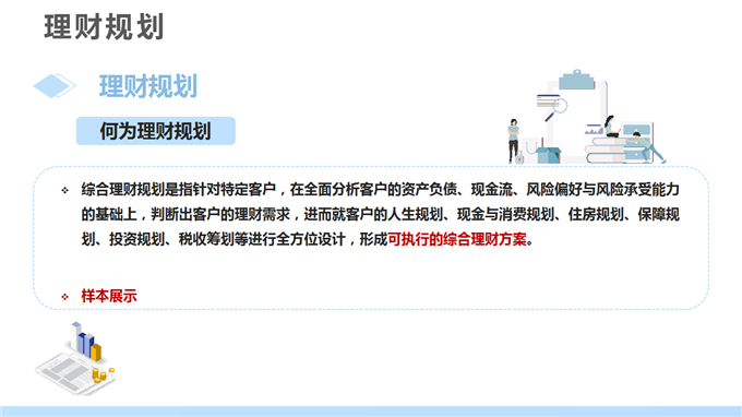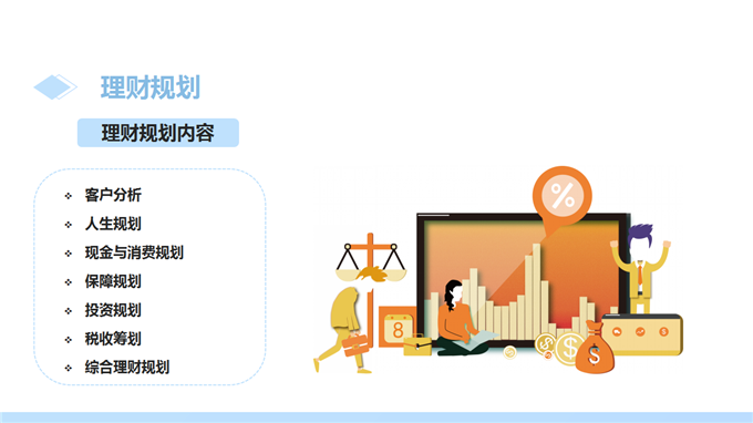 3、能利用综合理财分析,为客户进行现金规划、消费支出规划、教育规划、风险管理和保险规划、投资规划、税收筹划、退休金养老规划、财产分配与传承规划及综合理财规划。