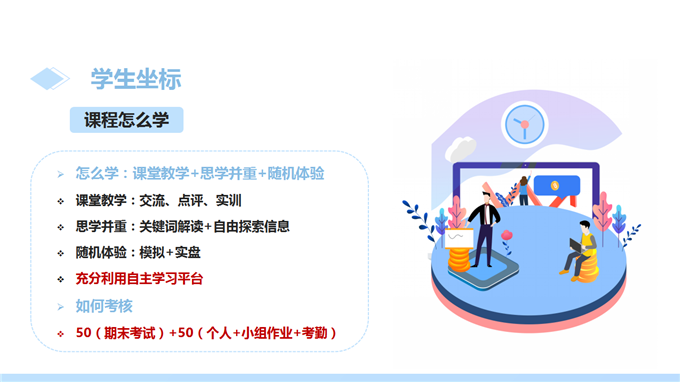 1、《个人理财》课程是以就业为导向,以能力培养为核心,以培养学生理财技能为目标,以个人理财的基本理论、基本方法和基本技能为主线组织教学内容。课程内容突出对学生职业能力的训练,相关理论知识均与所要完成的工作任务有密切联系,并充分考虑了高等职业教育对理论知识学习的需要,融合相关职业资格证书对知识、技能和态度的要求。通过本课程的学习,要求学生能熟悉个人理财的基础理论、个人理财业务相关法律法规、理财产品概述、客户分类与需求分析、理财规划计算工具与方法、理财师的工作流程和方法等七个部分的内容。根据本课程结构特点,教学过程采用项目式展现教学内容。通过案例教学、小组活动等形式将理论渗透于实践操作中的模式来组织教学,采用项目化考核方式,并鼓励学生考取相应的职业资格证书,为将来从事理财类工作岗位打下良好的基础。