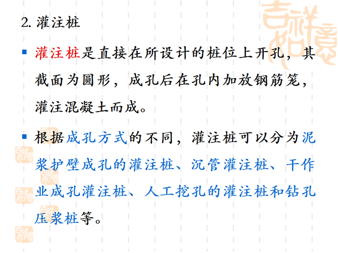 1.知识点一:桩的分类、灌注桩的施工工艺