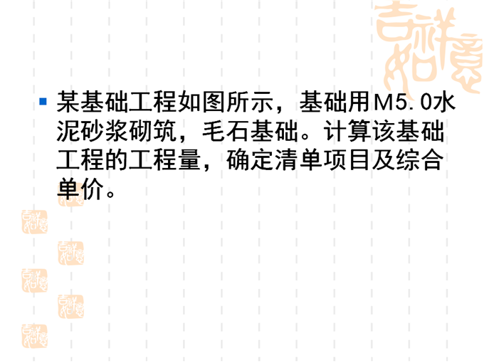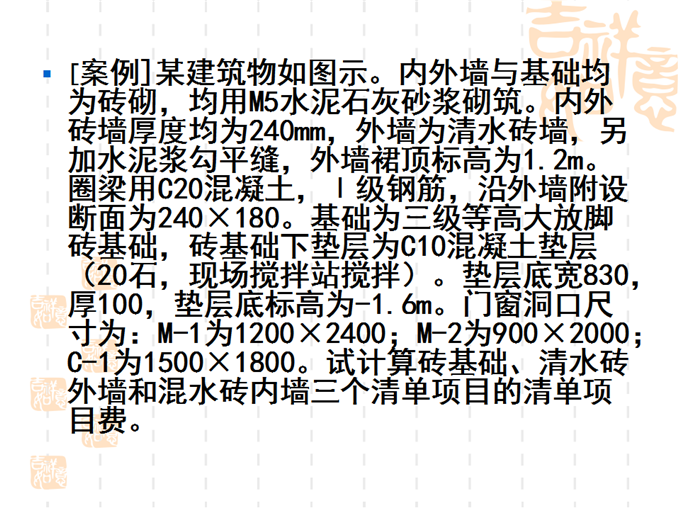 通过一道综合案例加深大家对基础与墙身工程量的计算,并通过查找定额算出砂浆消耗量及价格。