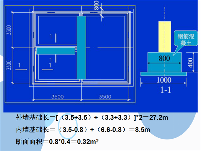 难点:基础与基础之间的搭接量的计算、定额的查找及混凝土消耗量的计算
