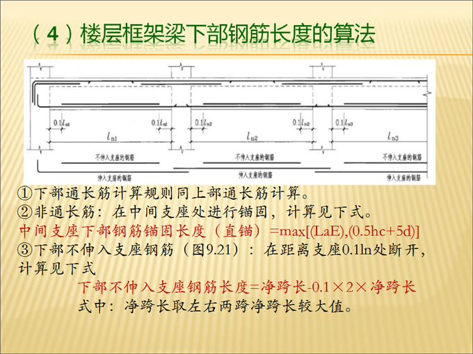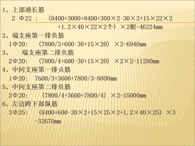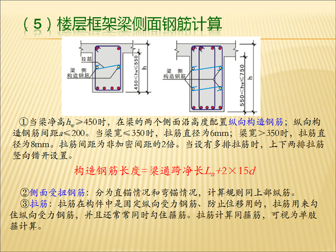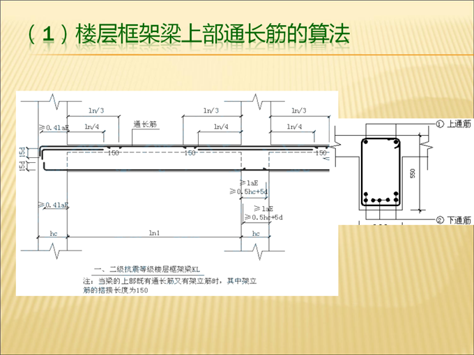 将梁钢筋进行分类后,再针对梁钢筋的每一部分进行讲授。(1)上、下部通长筋 (2)负筋 (3)箍筋 (4)拉筋