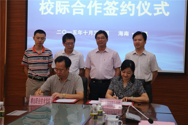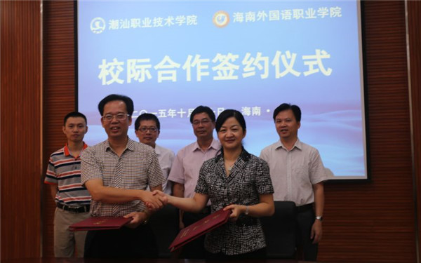 2015年10月29日,潮汕职业技术学院院长纪少游,跨境电商实战学院院长陈江生等一行三人赴海南外国语职业学院,就联合举办国际电子商务学院、跨境电商人才特别是小语种跨境电商人才培养、跨境电商师资培训、跨境电商进口创业和招收国际留学生等项目进行深入洽谈,并举行校际合作签约仪式。