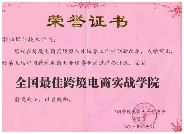 潮汕职业技术学院因在跨境电商实战型人才培养方面成绩显著,获得一致好评和认可,主办方揭晓了由权威机构评出的“最佳跨境电商实战学院奖”