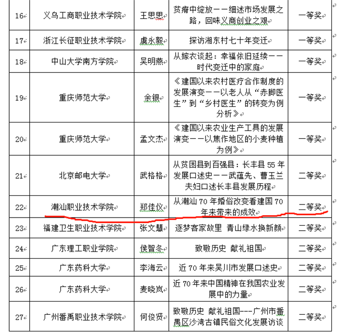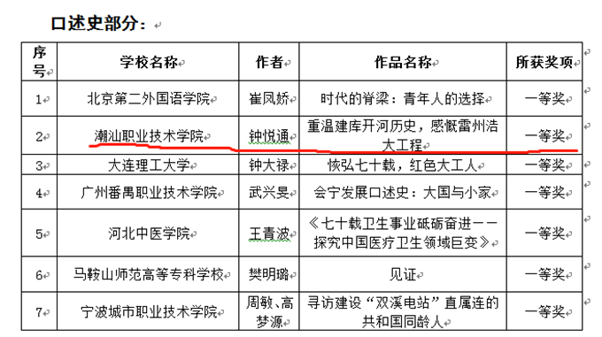 为全面推动习近平新时代中国特色社会主义思想进教材进课堂进学生头脑,落实好教育部新时代高校思想政治理论课教学工作基本要求,进一步深化思想政治理论课教学改革,2019年1月,全国高校思想政治理论课实践教学联盟征集2019年寒假实践教学活动成果。活动由《思想教育研究》编辑部、北京科技大学马克思主义学院等单位协办本次活动。 我校思政部高度重视本项比赛,2019年1月9日,思政部启动2019年寒假实践活动,赛前积极发动学生报名参加,比赛过程组织一支专门指导老师团队,多次召开交流培训会议,指导学生参加比赛。围绕“致敬历史献礼祖国”的主题,以庆祝中华人民共和国成立70周年时间节点为契机,聚焦讲好70年中国发展变化故事,由思政课教师指导学生利用寒假返乡机会,采访对家乡70年发展历史熟悉的老人或典型事件的亲历者,整理成口述史料;或是寻访具体的人物或事件来反映70年来(或某个历史时期)家乡的巨大变化或社会主义建设的伟大成就,通过微电影的方式加以记录呈现。本次活动面向2018级全体学生,结合思政课程开展假期实践活动,最终择优参赛。 2019年7月2日,全国高校思想政治理论课实践教学联盟2019年寒假实践教学活动成果征集活动公布获奖结果,在历时4个多月的选拔评比中,最终,我校学子喜获佳绩! 据悉,本次成果征集活动中,口述史部分共收集到来自全国74所学校报送的作品474件作品,微电影部分共收集到来自全国47所学校报送的作品94件作品。根据活动评选规则,主办方邀请相关专家进行网络评审和现场评议以及复审,最终评出口述史作品一等奖20项,二等奖35项, 三等奖50项,共计105项;微电影作品一等奖5项,二等奖10项,三等奖15项,共计30项。 经过层层选拔,最终我院有一支团队获得国赛一等奖,另有一支团队获得国赛二等奖,具体信息如下: 全国一等奖: 班级姓名:18级工管二班钟悦通 作品:《重温建库开河历史,感慨雷州浩大工程》 指导老师:黄其峰、林丹莼、陈凯萍 全国二等奖: 班级姓名:18级幼健三班郑佳仪 作品:《从潮汕70年婚俗改变看建国70年来带来的成效》 指导老师:黄其峰、林丹莼、陈凯萍 这是思政部继“思修”课程理想与信念演讲比赛和“毛概”课程课件制作比赛两个实践教学环节的又一次改革,思政部将进一步深化思想政治理论课教学改革,提升我校思政课教学质量和水平,以比赛为平台,将理论教学与实践训练进一步结合,以赛促教,以赛促学,坚持理论性和实践性相统一,进一步加强和改进学校思想政治工作,提升广大青年学生投身社会实践的积极性、主动性和创造性,教育引导学生立鸿鹄志,做奋斗者。