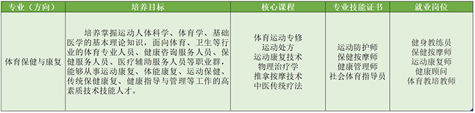 运动康复是康复医学的一个重要组成部分,也是全民健身实施的有力保障,它是新兴的体育和康复医学交叉结合的,以物理治疗为手段,以运动为特色的前沿学科。 本专业紧跟体医融合政策导向与市场需求,依托校内大健康产业学院优势,以及体育领域扎实的人才培养和校企合作基础,通过仿真教学和实景实战紧密结合,培养运动医学理论基础扎实、传统现代方法融汇贯通,熟练掌握运动处方制定与康复干预实施能力的专业运动康复人才。 培养目标:本专业培养德、智、体、美全面发展的掌握本专业的基本理论与技能,能在运动训练基地与场馆、医院、福利院、疗养院等保健康复机构从事运动损伤评估与治疗,运动训练康复等方面工作;能在康体养生、康体休闲、运动健身、健康管理中心、健康养生养老、公共卫生等领域从事教育、咨询及经营管理相关工作,具有创新精神、实践能力、人格健康的应用型人才。
