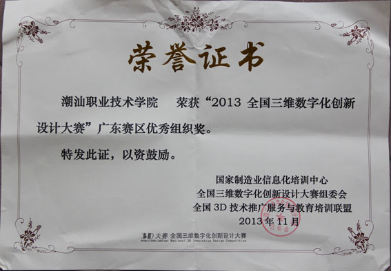 我院荣获全国3D大赛广东赛区优秀组织奖 在刚刚公布的2013年第六届全国3D大赛赛区选拔(复赛)广东赛区获奖名单中,我系师生荣获佳绩,当大家还沉浸在获奖的喜悦当中时,又传来了另一喜讯,我院荣获“全国3D大赛广东赛区优秀组织奖”,此次比赛我院数字设计工程系认真、详细的制定了培训计划和方案,积极组织动员室内设计、模具设计、工业设计等专业学生分别组队参赛,各专业教师为其全程培训、指导,认真设计制作参赛作品,最后在历时半年多的比赛中取得了优异的成绩,此次优秀组织奖的获得,也对我们的工作给予了肯定,我系全体教师一定再接再厉,积极组织学生参加各类技能竞赛,以赛促学,以比赛检验教学效果。 数字设计工程系 2013年11月19日