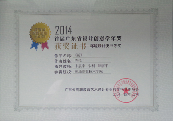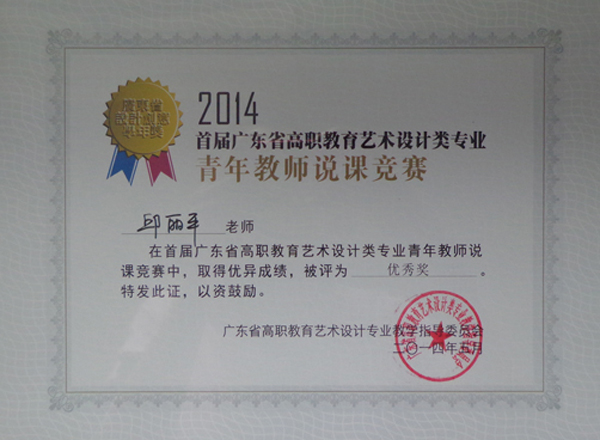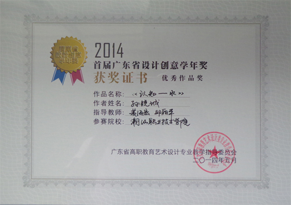 5月23日至25日,2014年广东省高职教育艺术设计类专业教学指导委员会年会在广州番禺职业技术学院召开。本届年会围绕高职艺术设计专业教学改革而展开,会议期间,举办“2014首届广东省设计创意学年奖”评比和“2014首届广东省高职教育艺术设计专业青年教师说课竞赛”。 来自广东省41所高职院校艺术设计类作品参加了首届广东省设计创意学年奖的评比,经大赛评审专家组评审、组委会审定,我院数字系由宋震宇、朱利、邱丽平三位老师指导的室内设计专业陈悦同学的作品《韵》获环境设计类三等奖,由黄海宏、邱丽平老师指导的广告设计专业孙锐城同学的作品《认知-水》获视觉设计类优秀奖。 陈悦同学的作品《韵》获环境设计类三等奖 孙锐城同学的作品《认知-水》获视觉设计类优秀奖 在首届广东省高职教育艺术设计专业青年教师说课竞赛中,41所高校的参赛教师进行现场竞技。经过激烈的角逐,我系贾晓华老师获得环艺组三等奖,邱丽平老师获得视觉传达组优秀奖。 邱丽平老师获得视觉传达组优秀奖