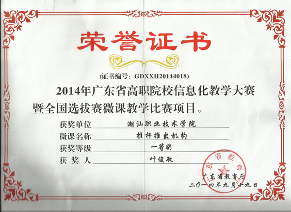 近日,广东省第二届全国高校微课教学比赛结果揭晓,在 “广东省第二届高校微课教学比赛”中,我系叶俊敏老师的微课作品《推杆推出机构》获得一等奖。