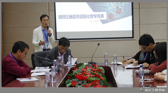 接着由建筑与室内艺术设计教研室主任朱利老师和设计工程学院黄海宏院长作参赛经验分享。朱老师从赛前准备、比赛过程、到比赛后的反思,详细而生动地介绍了去年参加广东省高等职业院校艺术设计专业首届信息化教学设计竞赛全过程的心得体会,为与会的老师们理清了参赛思路和流程。黄海宏院长则从“如何正确的看待信息化教学竞赛”入手,深入浅出的为老师们分析了全国职业院校信息化教学大赛的目的、意义、要求和发展趋势等,并通过获奖案例,给老师们讲解如何了解竞赛要求,如何做好参赛准备,如何做出优秀参赛作品,以及参赛注意事项等,他还鼓励老师们应该积极地参与竞赛,不断提升个人信息化教育教学水平。