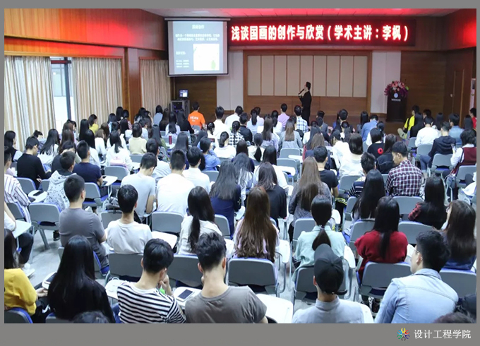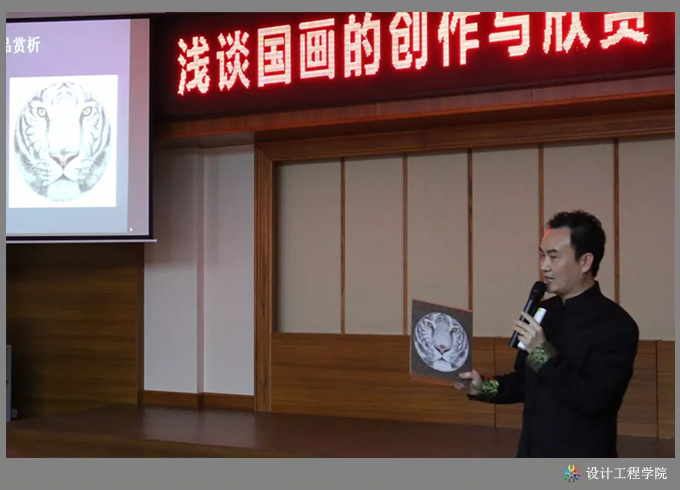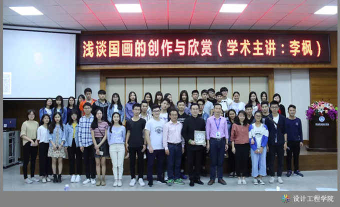 讲座伊始,李枫画家以自身经历为例,向大家讲述了自己从初学素描到拥有丰硕成果的中国画画家的成长历程,他在中国画艺术道路上持之以恒的探索精神,让在座的师生无不钦佩。李枫画家还围绕什么是国画、如何欣赏国画、国画的分类、国画中的先辈人物及代表作等展开了剖析…… 最后,李枫画家结合个人的一些国画创作给大家做了分享,他强调创作是一个画家综合素质的总体体现,它包括画家的绘画技巧、艺术修养、人生阅历等。