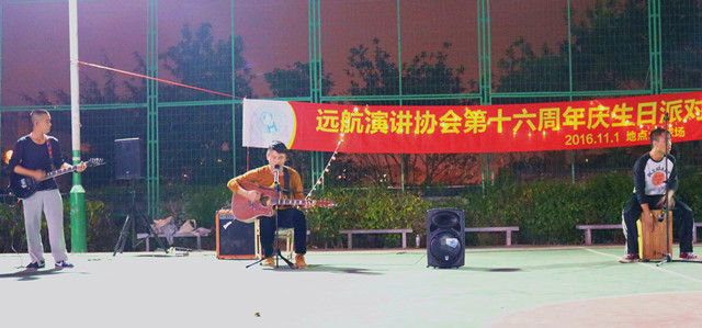 晚会由远航演讲协会指导老师的精彩致辞拉开序幕。晚会现场灯光闪耀,星际艺术团街舞队带来动感十足的舞蹈表演,声乐队献上一首动听深情的歌曲《听海》将观众迅速带入晚会中来。酷炫的动感舞步,炫丽的音乐旋律,为观众带来一场视听盛宴。而远航演讲协会的同学更是通过演讲了《我的大学我的梦》为现场观众讲述大学作为人生的一个新开始,新方向,要确立人生目标,为之努力拼搏。同时晚会还设置了互动游戏环节,同学们踊跃参与。晚会在生日歌响起的瞬间,以一张大合照圆满结束。 忆往昔风雨兼程,岁月如歌,远航演讲协会在这十六周年中取得属于自己的成就。此次晚会的成功举办更是可以看出协会干部干事的能力以及背后所付出的努力。希望远航演讲协会面对未来能够越办越好! 歌曲表演