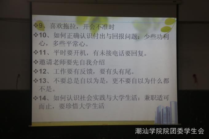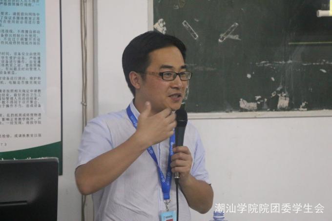 为进一步加强院团委学生干事工作作风,提高干事工作能力,强调作为学生干事应具备的态度、素质以及正确的价值观。2016年11月9日下午4时,潮汕学院于科技楼105召开第三期干部培训班。团委书记、学生处处长王克明为学生干部授课。 会议伊始,王处长以“学生干部的认知和能力培养”为主题展开讲话,王处长表示对于刚踏入大学的新生来说,对大学的一切事物都是感到迷茫的,不知所措、厌烦的;对于以上各种情况王处长还表示作为学生干部拥有端正的态度,良好的作风,不怕苦的精神,才能作为潮院的新血液。学校如同一艘巨轮,每位同学都不可缺少,没有团体精神的组织终究会沉浸在大海中。 本次会议还着重强调了在日常生活上的各种处事行为,与他人要友好相处,不看低他人,不做出影响他人的行为。构建一个美好、和谐的校园,遵守学校颁布的各项规章制度;才能营造校园良好环境。本次会议使各学生干部摆正心态,更好的面对以后的大学生活。看清现实环境,看清努力方向,看清真实自我。此次培训使干部们受益良多,也让我们认真思考自己在大学生活中的定位。愿在场的干部能够将王处长的话语牢记在心中,也愿学院在今后的道路上越走越远,越来越好! ![]() 学生处处长王克明 ![]() 授课内容