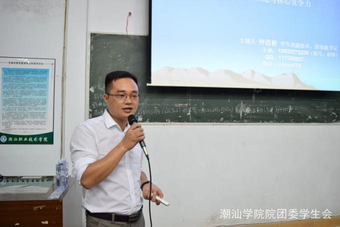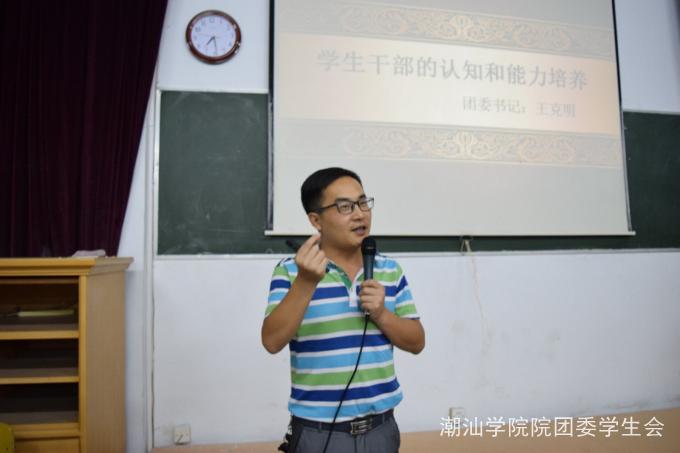 2016年11月13日晚7点30分,潮汕学院于科技楼105,205召开第三期学生干部培训班。团委书记王克明、团委副书记钟逍彬作为此次培训的主讲人。