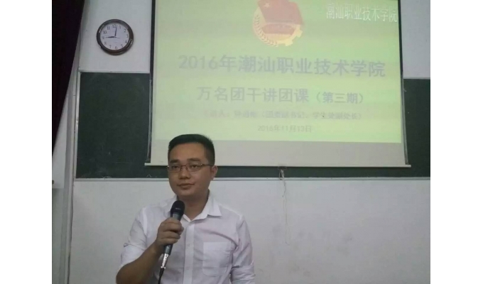 干事培训开讲啦! 你以为只要进入星际艺术团就够了吗?虽说小鲜肉都是经过层层选拔挑选出来的,但我们还是要接受培训,进一步完善自己,谁让我们星际艺术团是高逼格的呢! 11月13日晚,潮汕学院团委“万名团干讲团课”系列讲座第三期在科技楼举行。团委书记王克明、副书记钟逍彬分别以“学生干部的认知和能力培养”和“如何当好一名学生干部”为题进行授课,对学生干部进行理论武装,确保学生工作的顺利开展。 ![]() 团委书记王克明