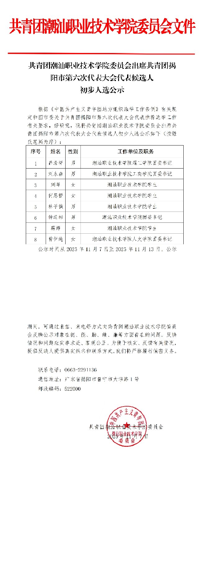 共青团潮汕职业技术学院委员会出席共青团揭阳市第六次代表大会代表候选人初步人选公示