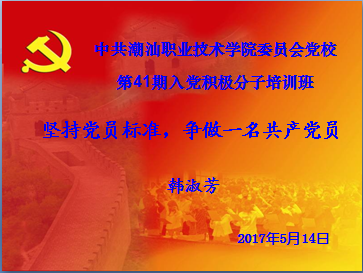 5月14日上午,潮汕学院第41期党校培训班“坚持党员标准,做合格党员”专题讲座在综合楼第二学术报告厅举行,学院党委书记韩淑芳担任此次讲座主讲。 课上,韩淑芳书记讲解了党员的标准和基本任务,用现实生活中的例子去激励同学们积极向党组织靠拢,强调同学们应坚持大学生党员八大标准,弘扬中华传统文化,注重文明礼仪修养提升自身道德修养;并希望同学能能做一个品格高尚的人,提高自身人格魅力;在日常生活中做一个积极向上的人,不畏艰辛,学会改变自己去适应环境;以身作则从小事做起,全面提升自身素质;常怀感恩之心,心系母校发展,做一个会感恩的人。 本次讲座坚定了同学们向党组织靠拢的信念,为同学指明了方向,使同学们的思想有了质的飞越! 培训主题 学院党委书记韩淑芳 培训现场 入党积极分子积极发言 审核:吴晓祈 谢波 编辑:吴丹桂 摄影:王苑 排版:高红玲