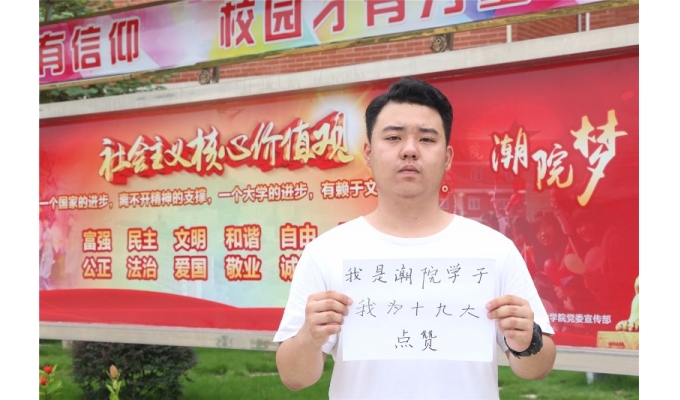 10月18日,潮汕学院学生党支部携手院团委六大学生组织主席团,以及团委新媒体中心,在十九大期间用画笔和镜头记录庆祝十九大的召开。 一句句祝福“聚焦十九大,迸发潮力量,我们是潮汕学子,我们为十九大点赞”让同学们感受到了党的全面领导地位、党的先进性及科学性,感受到了政治生活就在身边。 此次活动,不仅庆祝了十九大胜利召开,而且让同学们感受到了党的全面领导地位,砥砺前行十九大,不忘初心跟党走。祝愿祖国繁荣昌盛越来越好。 学生党支部组长王吉欣 院团委学生会主席陈翰林 社团联合会主席赵佳明 审核:吴晓祈 排版:高红玲