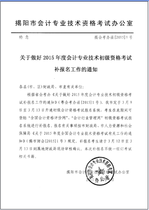 关于做好2015年度会计专业技术资格考试补报名工作通知。