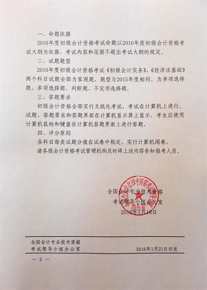 关于2016年度全国会计专业技术初级资格考试题型等有关问题的通知。