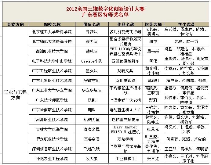 经过9个月的经过学校初赛、网络公示投票、作品资格审查、赛区复赛评审,由潮汕职业技术学院数字设计工程系朱红林老师、周书兴老师、吕旺虹老师、叶俊敏老师组队参加2012年第五届全国3D大赛赛区选拔(复赛)广东赛区获奖名单已经陆续揭晓。最终,我系选送的作品在整个广东赛区所有四百多个参赛作品中脱颖而出,我系分别参加工业与工程方向和数字建筑BIM方向共荣获2个特等奖、6个一等奖、11个二等奖、4个三等奖。