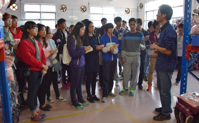 物流管理教研室主任李宝苏老师和仓储中心主任王光辉老师亲自为学生们一一讲解和介绍,同学们好奇地看、用心地听、认真地记、主动地问,还有学生在14级实训师兄的指导下,体验了一把货物托盘上架到位训练,过了一把瘾。王老师说,仓储配送中心是潮汕学院物流产业学院实施学徒制人才培养,校企合作共建,实践化教学,实战化训练的企业平台,欢迎明年15级学生来基地实训实习。