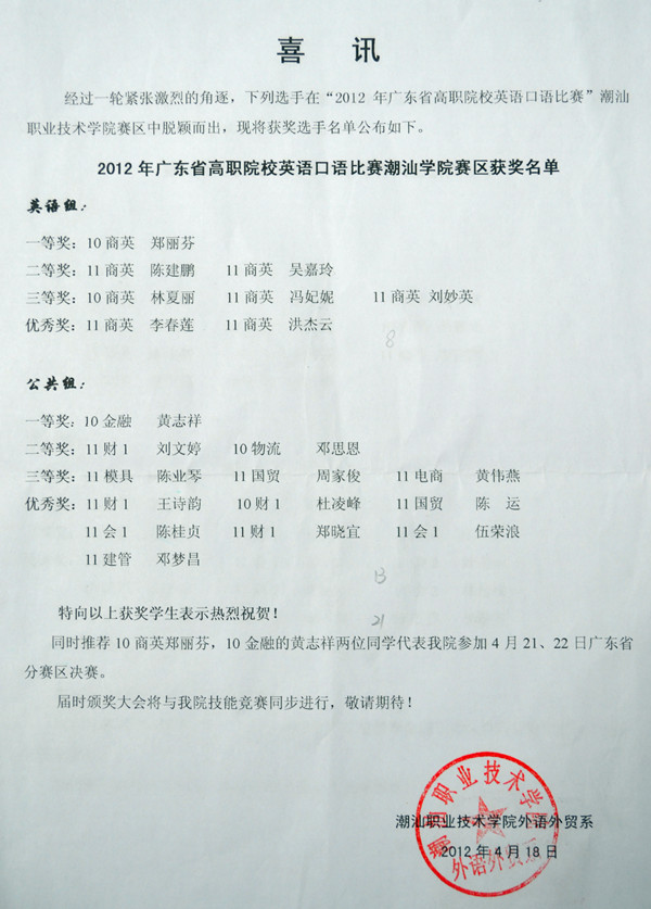 2012年广东省高职院校英语口语比赛潮汕学院赛区获奖名单