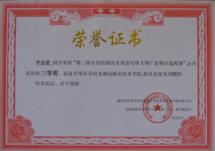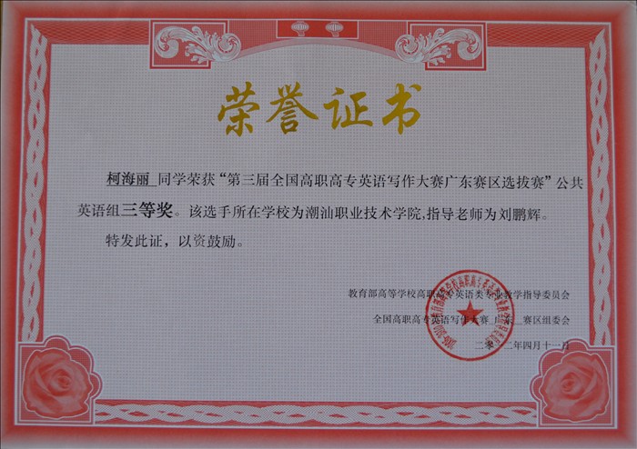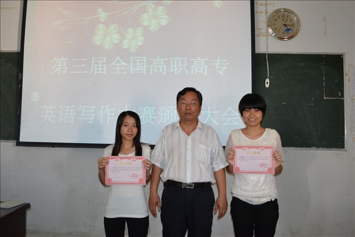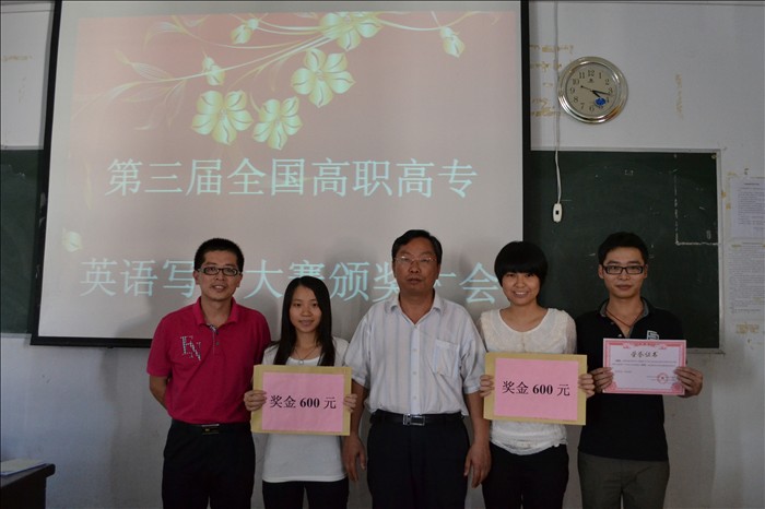 近日,从全国高职高专英语写作大赛组委会获悉,由我院外语外贸系刘鹏辉老师、吴丹妮老师指导的李金清、柯海丽等同学在第三届全国高职高专英语写作大赛中,共同获得了广东赛区公共英语组三等奖的好成绩。 为保证本次英语写作大赛的顺利进行,我系于2012年3月初就成立了英语写作大赛组委会。大赛组委会由我系陈江生主任、陈碧玲老师负责组织领导,我系相关教师具体负责大赛的具体实施,对英语写作大赛的目标、内容、题型、时间、方式等做出详细的安排。 3月中旬,我系先后组织了我院英语专业组和公共英语组(非专业组)进行英语写作比赛初赛,100多位同学参加了比赛。赛场上,参赛同学沉着冷静,积极思考,发挥出了应有的能力和水平。通过评委教师的认真批阅,两个组分别评选出一等奖、二等奖、三等奖及优秀奖共计30名。经过我院初赛的选拔及刘鹏辉老师、吴丹妮老师的精心指导,我院派出3名学生参加了在广州举办的广东赛区总决赛,并取了优异的成绩 本次英语写作大赛,培养了学生的英语写作能力,必将进一步推动我校大学生英语应用能力的整体提高,促进全校英语教学的发展。
