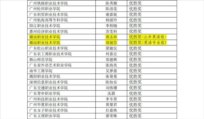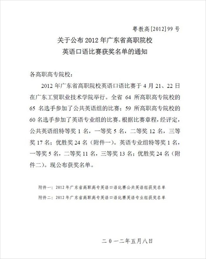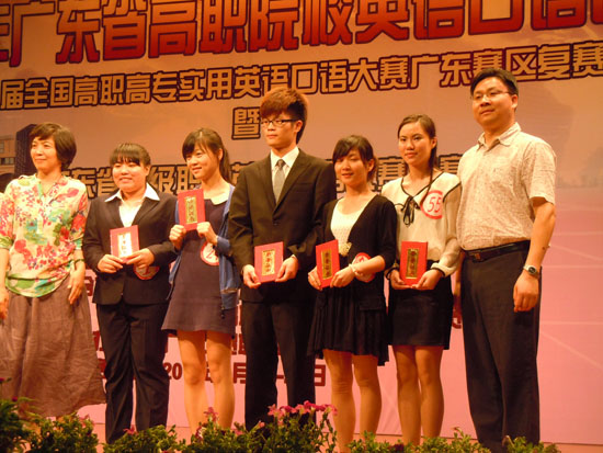 2012年广东省高职院校英语口语大赛、第八届全国高职高专实用英语口语大赛广东赛区复赛暨广东省高级职业英语口语大赛决赛于 本次大赛由省教育厅主办,高等教育出版社和省高职高专英语教学指导委员会协办,广东工贸职业技术学院承办,旨在促进广东省高职高专英语教学改革,加强学生职业英语能力的培养,提高学生职业英语口语表达能力,展示高职学生英语口语水平,交流职业英语口语教学经验,同时选拔优秀选手参加"全国高职高专实用英语口语大赛"决赛。来自省内60多所高职院校的100名选手分别参加了公共英语组或专业英语组的比赛。 本学期,我院先后在第三届全国高职高专英语写作大赛和英语口语大赛中所取得的不错成绩,离不开我院提出的“以赛促学,以赛促教”正确指示,离不开学院领导支持和鼓励。与此同时,本次大赛所取得的优异成绩也是老师们辛勤耕耘,同学们努力拼搏收获的硕果,充分展示了我院英语教学水平和英语教学改革的成果。